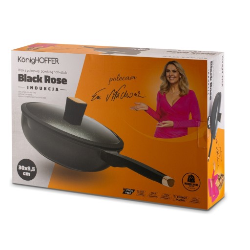 Duża patelnia WOK Konighoffer Black Rose 30 cm wykorzystuje powłokę non-stick MARBLE PLUS ułatwiającą pielęgnację (nie do zmywarki, tylko mycie ręczne). Produkt jest solidny i pozwala na bezpieczne smażenie, zmniejszając ryzyko oparzenia dłoni. Ma również stylowy uchwyt soft touch, który się nie nagrzewa i nie ślizga w ręce. Z głęboką patelnią nieprzywierającą Black Rose możesz tworzyć posiłki na każdym typie kuchenki. Elegancji dodaje jej marmurowa powłoka nieprzywierająca, która wytrzyma wiele cykli ścierania (10 000!) oraz wykończenie aluminiowego korpusu odlewanego i bardzo dobrze wyważonego. Nagrzewa się szybko, a więc oszczędzisz czas i energię. Świetnie sprawdzi się w rodzinnej kuchni lub jako prezent. Jest też dobrze zabezpieczona przed wysoką temperaturą i równomiernie przewodzi ciepło. Zapewnia pewny chwyt podczas przenoszenia. O jej bezpieczeństwie użytkowania oraz konstrukcji nietoksycznej dla środowiska stanowi oznaczenie PFOA Free. Linię rantu przełamują tu dwie wylewki umożliwiające precyzyjne zlewanie sosu lub wytopionego tłuszczu. Prezentowany WOK Black Rose ma także pokrywkę w komplecie. Jej dedykowana średnica i silikonowy rant zapewnią ci wysoką wydajność duszenia składników. Pokrywa również wyposażona jest w uchwyt typu soft touch. Wspólnie z marką Konighoffer, odkryjesz twój przepis na dom. Ten produkt ci to ułatwi. Poleca go też ambasadorka, Ewa Wachowicz. Oczywiście z ciepłym uśmiechem. To jedna z najlepszych opcji w swoim rodzaju!