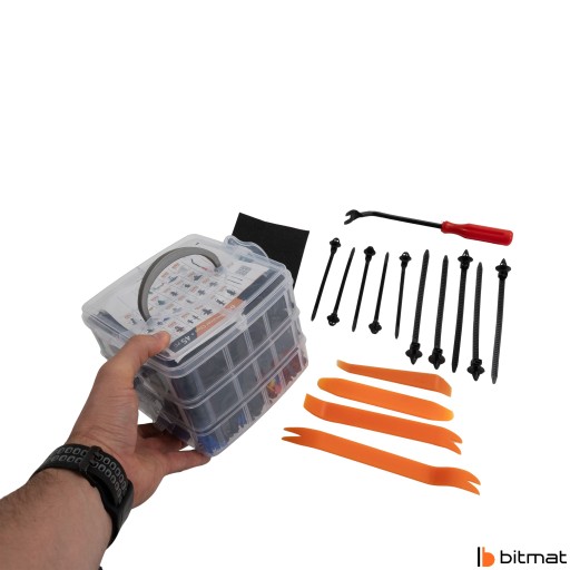 715 пластиковых автомобильных зажимов, 10 лент, 5 съемников боковых панелей.