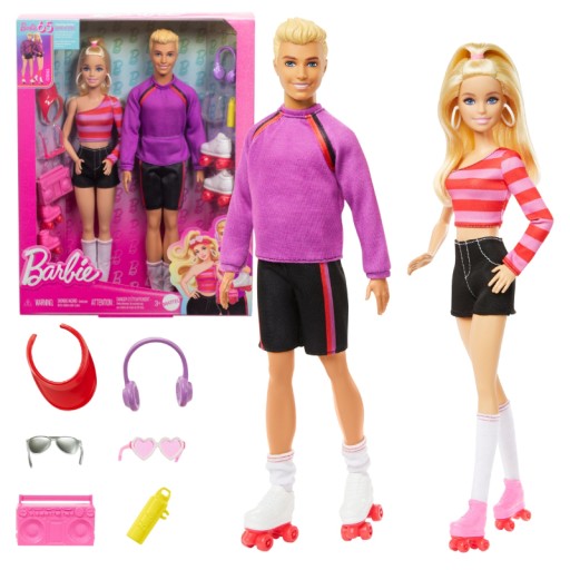 Ken natomiast prezentuje się równie stylowo – ubrany w fioletową koszulkę z paskami oraz czarne szorty, gotowy do wspólnej jazdy w białych wrotkach. Jego wygląd uzupełniają klasyczne skarpetki, które dopełniają stylową całość.