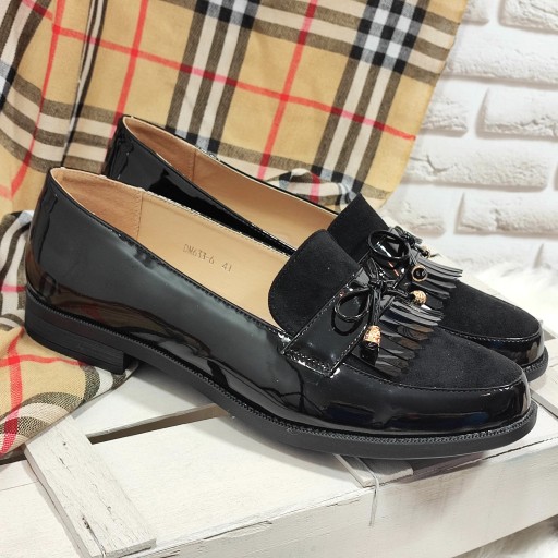 Wykonane z miękkiej lakierowanej skóry ekologicznej klasyczne mokasyny damskie. Połączenie dwóch faktur - połyskującego lakieru i matowego zamszu. Płaski obcas. Wewnątrz miękka, komfortowa wkładka z naturalnej skóry.