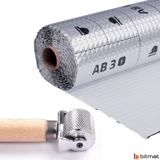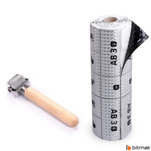 Mata butylowa AB-3s jest samoprzylepna, elastyczna i bardzo prosta w montażu. Wystarczy dokładnie wyczyścić i odtłuścić (polecamy zmywacz uniwersalny, dostępny na naszych pozostałych ofertach) wygłuszany element, następnie przyciąć (do cięcia polecamy nóż tapicerski, dostępny na naszych pozostałych ofertach) i przykleić fragment maty wygłuszającej. Ułożoną matę butylową należy dokładnie rozwałkować wałkiem (dostępny na naszych pozostałych ofertach). Tylko dobrze rozwałkowana warstwa aluminium gwarantuje wysoką jakość wygłuszenia.