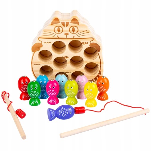 Centralnym elementem tej gry jest uroczy koteki oraz wędki i rybki które zostały wyposażone w specjalne magnesy. Dzięki temu unikalnemu rozwiązaniu, rybki i wędki wspaniale się przyciągają, tworząc fascynujący element dynamicznej rozgrywki. Gra polega na wykorzystaniu magnetycznych właściwości tych elementów, by precyzyjnie wyciągnąć i umieścić rybkę w podstawie, która jest w kształcie kotka. To zadanie wymaga skupienia, cierpliwości i umiejętności manipulacyjnych, co sprawia, że gra jest doskonałą okazją do ćwiczenia zdolności manualnych.