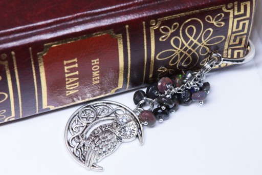 Elegancka zakładka do książki z zawieszką w kształcie sowy dodatkiem prawdziwego opalu etiopskiego oraz ze srebrnym hematytem.