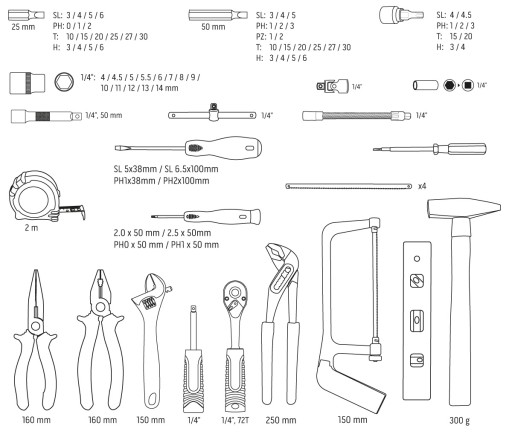 - Wkrętaki precyzyjne (4 sztuki):, 2.0x50 mm, 2.5x50 mm, PH0x50 mm, PH1x50 mm