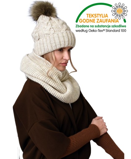 Elegancki KOMPLET - Wykonany jest z miękkiej grubej przędzy o zdobnym wzorze co dodaje oryginalności modelowi. Fason z pomponem - idealny do każdego typu twarzy. Komin gruby mięsisty , można owinąć na 2 razy. Zestaw jest idealny do każdego ubioru eleganckiego a także sportowego. Polska Produkcja Najlepsza jakość