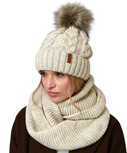 ❄️Bestseller MODEL - damski KOMPLET mięsisty dziany CZAPKA z polarem i pomponem KOMIN w zdobny gruby wzór Polskiej firmy ❄️