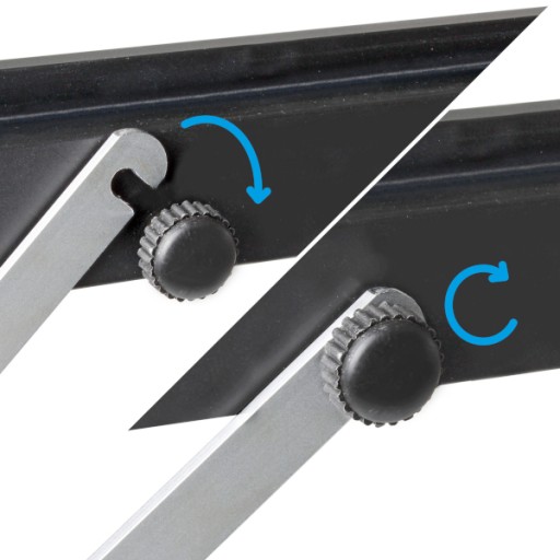 - Jedna noga stołu z blokadą, z regulowaną wysokością, co pozwala na wypoziomowanie stołu praktycznie w każdym terenie