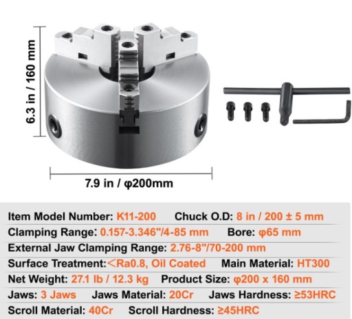 Trójszczękowy uchwyt 200 mm wykonany jest z materiału HT300 o wysokiej wytrzymałości, charakteryzującego się dużą wytrzymałością na ściskanie i długą żywotnością. Posiada wewnętrzną i zewnętrzną szczękę do mocowania większych części przemysłowych oraz funkcję samocentrowania, aby uniknąć ponownej kalibracji.