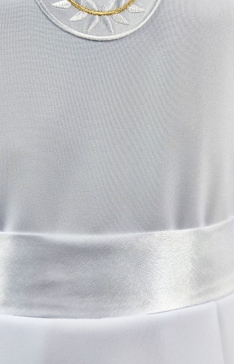 Rękawy i dół sukienki ozdobione są delikatną, złotą lub srebrną tasiemką. Góra sukienki jest dopasowana zaszewkami, dzięki czemu idealnie się układa. W talii wszyta jest satynowa szarfa do zawiązania z tyłu. Pod szyją wykończona białą, satynową lamówką. Dół sukienki podszyty jest halką, która została usztywniona falbaną z tiulu, przez co spódnica jest zwiewna i nieprześwitująca. Cała sukienka zapinana jest na zamek.