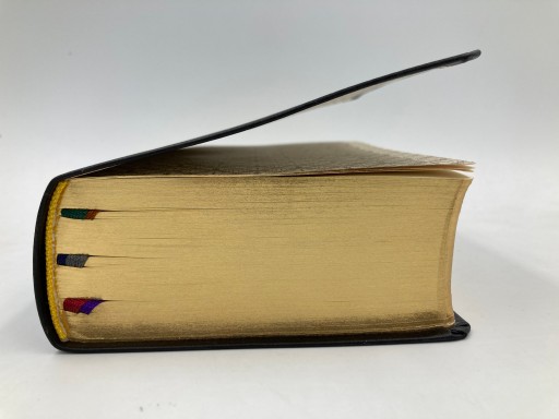 Dzieło występuje także w wersji oprawy wykonanej ze skóry z zamkiem – to bardzo funkcjonalne rozwiązanie, za którego sprawą strony naszego Mszału pozostaną nienaruszone w czasie podróży. Tego typu okładka nie dość, że stanowi swoisty futerał, to dodatkowo rewelacyjnie się prezentuje – poza złoceniami, upiększono ją także ciekawym tłoczeniem. Tak samo, jak w przypadku pierwszej wersji Mszał posiada pozłacane brzegi oraz sześć tasiemek.