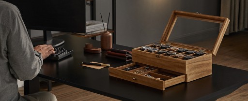 Zobacz, jak ten elegancki organizer na zegarki nadaje stylu Twojej kolekcji dzięki swojej rustykalnej drewnianej ramie i szklanej pokrywie