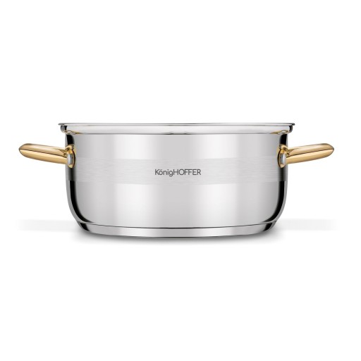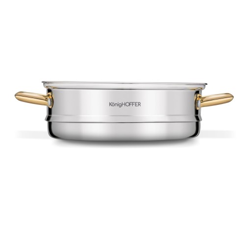 Garnek do gotowania na parze Konighoffer Faro Gold ma pojemność 2,9 l. Produkt wykonano z trwałej stali nierdzewnej i wyposażono w nitowane uchwyty. Składa się on z 3 elementów i jest prosty w pielęgnacji (tylko mycie ręczne). W takim garnku z wyjmowanym sitkiem przygotujesz dla bliskich lekkostrawne i zdrowe posiłki. Użyjesz go do różnych składników, w tym mięs, pyz oraz warzyw. Co więcej, ugotujesz na parze dania bez względu na rodzaj kuchenki. To dlatego, że garnek ma dno przystosowane do użytku na płycie indukcyjnej, ceramicznej, elektrycznej i gazie. Solidne mocowanie rączek da ci bezpieczeństwo podczas przenoszenia oraz pewny chwyt. Jednym słowem zyskasz solidny i energooszczędny garnek do gotowania na parze, który po wyjęciu wkładu z sitkiem może być klasycznym garnkiem do zupy. W komplecie jest przecież dedykowana pokrywka szklana. To dzięki niej jeszcze lepie zatrzymasz w jedzeniu wartościowe mikroelementy, witaminy i zadbasz o soczystość składników.