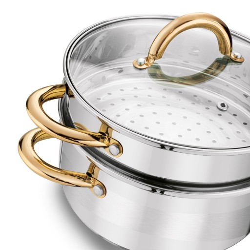 Pozostałe informacje: - garnek oraz wkład do gotowania na parze ze stali nierdzewnej, -uchwyty stalowe, nitowane, -pokrywka szklana ze stalowym rantem i odpowietrznikiem, -wysokość garnka:9,5cm, -wysokość wkładu:7cm, -wysokość garnka z wkładem bez pokrywy: 14cm, -tylko mycie ręczne, -uchwyty w kolorze złotym