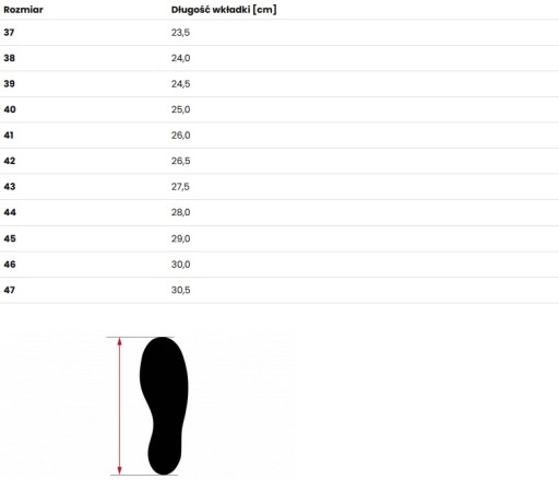 Połóż na podłodze kartkę papieru tak, by jeden jej brzeg przylegał do ściany. Stań na papierze z piętą przy ścianie. Zaznacz ołówkiem miejsce, w którym kończą się Twoje palce. Zmierz na papierze odległość między ścianą, a zaznaczonym przez Ciebie miejscem, a następnie porównaj tę długość z długością w naszej tabeli rozmiarów.