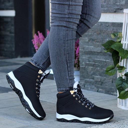 Wygodne CZARNE TRAPERKI SPORTOWE MOCNO OCIEPLONE GRUBYM BIAŁYM FUTERKIEM