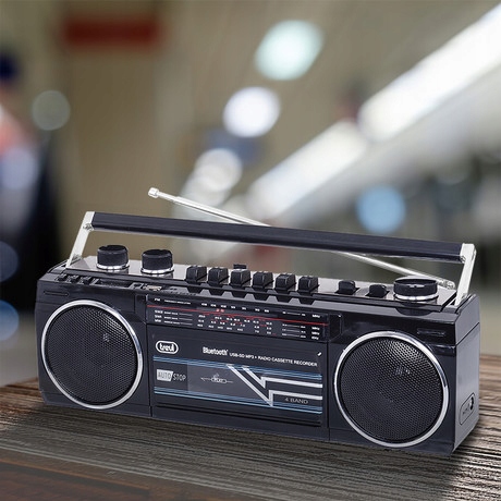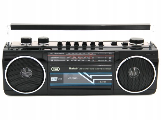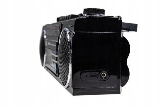 Radiomagnetofon w stylu klasycznego odtwarzacz z lat 80. Prostokątny z uchwytem do przenoszenia i okrągłymi głośnikami po obu stronach.