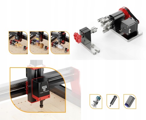 Bezpośrednie sterowanie wieloma akcesoriami: zestaw wspomagania pneumatycznego, moduł 4. osi, moduł laserowy 20 W, frezarka do drewna(Zestaw wspomagania pneumatycznego, moduł 4. osi, moduł laserowy 20 W - akcesoria do nabycia oddzielnie)