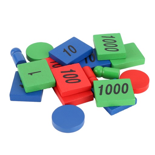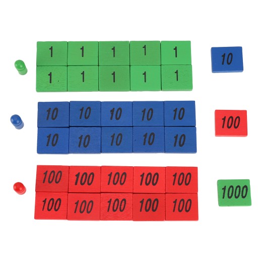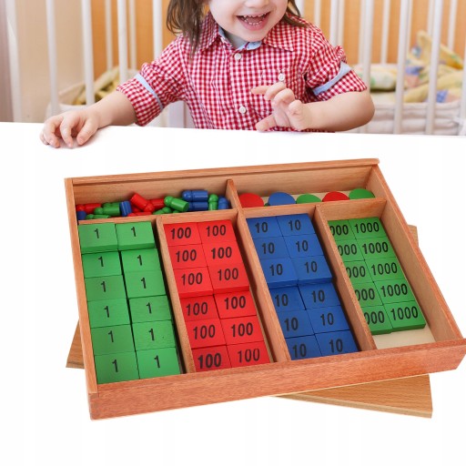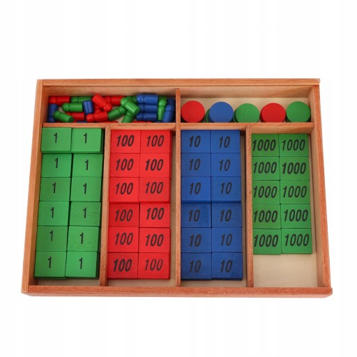 3. Drewniane pudełko z sześcioma przegródkami zawiera zielone, niebieskie i czerwone drewniane płytki oznaczone numerami 1, 10, 100 i 1000.