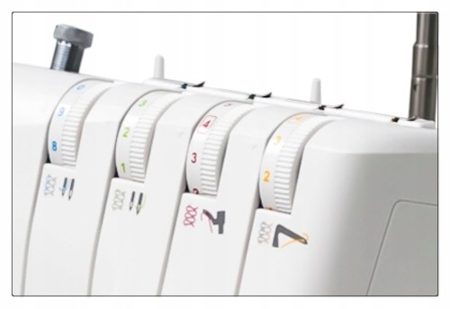 Każda z 4 nici ma indywidualną regulację naciągu z precyzyjnie wyskalowaną podziałką i kolorowe oznaczenia dla we wszystkich punktach istotnych dla prowadzenia nitek. Ostrze noża odkrawającego wykonano ze stali HSS, zapewniającą mu długotrwałą i precyzyjną pracę. Na ścinki obcinanego materiału, producent przygotował zgrabny dopinany pojemnik. Owerlok posiada tzw. wolne do obszywania na okrągło.