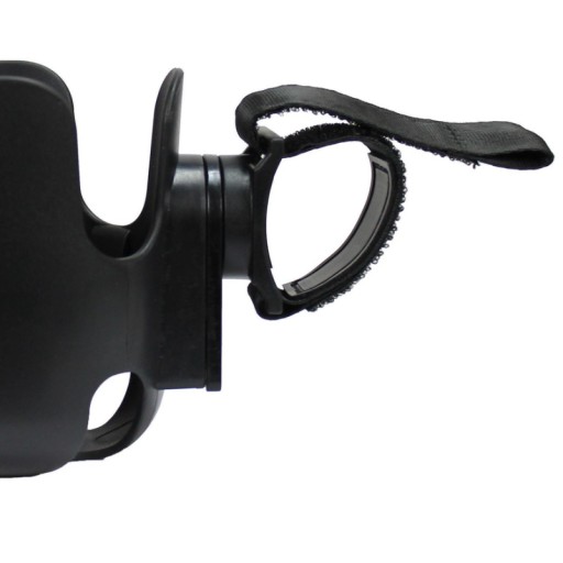 Uchwyt obraca się o 360°, co pozwala na dowolne umiejscowienie go na wózku oraz ustawienie pod idealnym kątem. Montowany za pomocą regulowanego paska na rzep, posiada antypoślizgową powłokę, która zapewnia stabilne trzymanie się na wózku, nawet podczas jazdy po nierównym terenie.