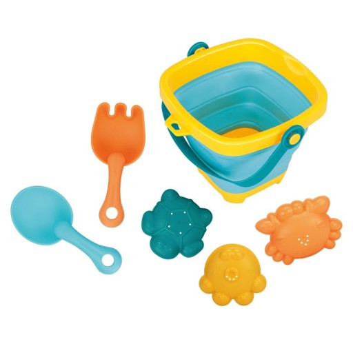 Góra, spód i rączka wiaderka są plastikowe, a ścianki wykonane są z grubego silikonu składanego ''jak harmonijkę''. Plastikowe są również grabki i łopatka.