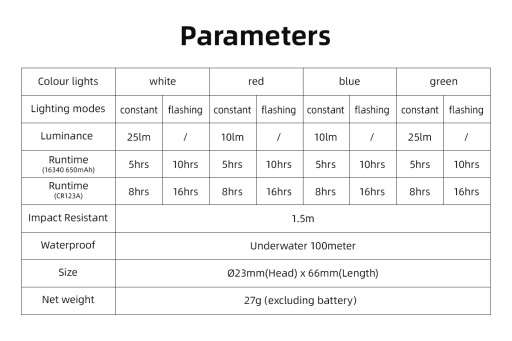 - Zasilanie: 1 x akumulator Li-ION 16340 lub 1 x bateria litowa CR123A (niedołączone)