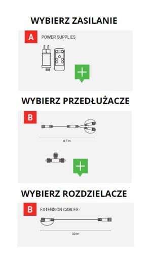 *- przedłużacz/rozdzielacz nie jest wymagany, można połączyć zasilacz bezpośrednio do oświetleni