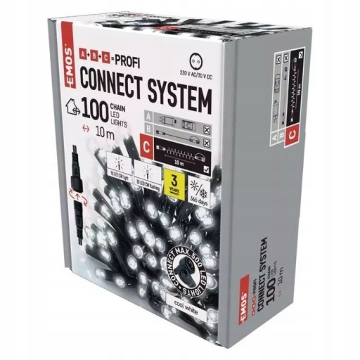 Światełka choinkowe D2AC03, wyposażone są w system łączenia PROFI , który umożliwia przedłużenie łańcucha, dlatego w zestawie nie ma zasilacza. Łańcuch wyposażony został w 100 sztuk diod led z zimnym światłem, które na zmianę świecą stale i migają. Dekoracyjne oświetlenie marki EMOS mierzy 10m długości i przystosowane zostałodo użytku w pomieszczeniu oraz na zewnątrz (stopień ochronny to IP44). Żywotność diod LED jest szacowana na 10 000 godzin, materiał z jakich został wykonany to guma. Zastosowane diody led posiadają klasyczny kształt i są wielkości 7mm . Produkt objęty gwarancją producenta.