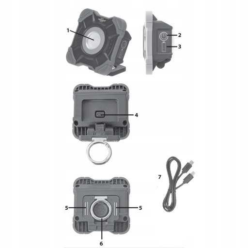 Reflektor budowlany jest ładowany poprzez interfejs ładowania i za pomocą dostarczonego kabla do ładowania typu USB C DO USB C.