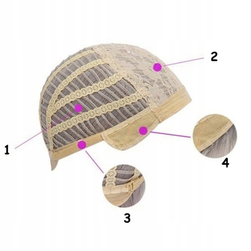 Wewnątrz wewnętrznego kapelusza znajdują się 2 regulowane paski z haczykami. Haczyki można przymocować z pozycją ①-⑦, aby pasować do kolejnego obwodu głowy. (Kolor sieci wewnętrznej zostanie starannie wybrany, idealnie pasujące do peruki.)