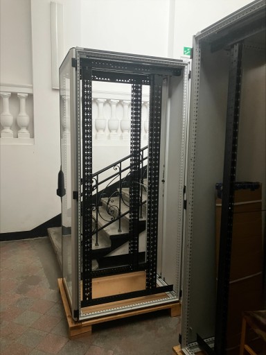 Solidna konstrukcja z przeszklonymi drzwiami, idealna do serwerowni i centrów danych. Wyposażona w standardowe otwory montażowe, zapewnia łatwy dostęp do sprzętu. Jest to szafa o wysokości 46U, co czyni ją wyższą od standardowej 42U. Wysokość wynosi ponad 2 m.