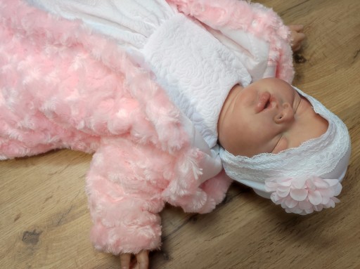 Do wyboru komplet (sukienka i czapeczka) biały lub ecru, płaszczyk różowy.