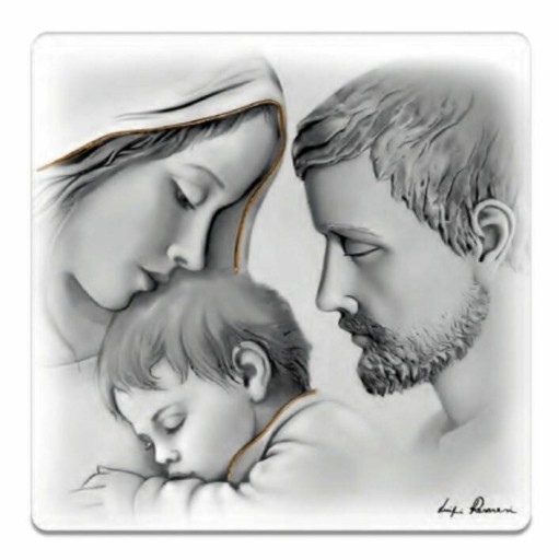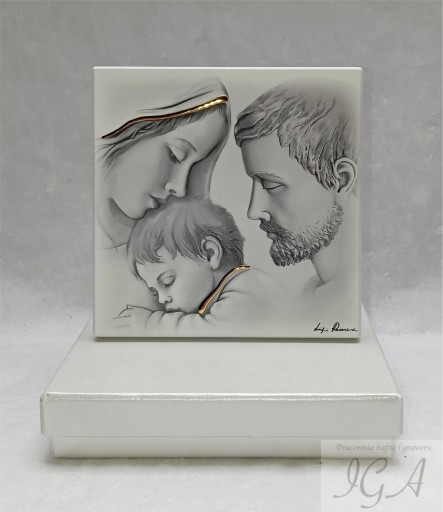 Obrazek malowany na drewnie, zdobiony złotą ręcznie malowaną farbą, przedstawiający wizerunek Świętej Rodziny.