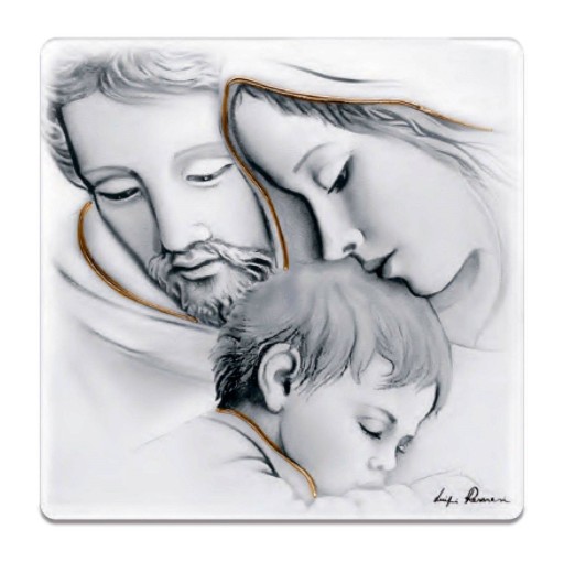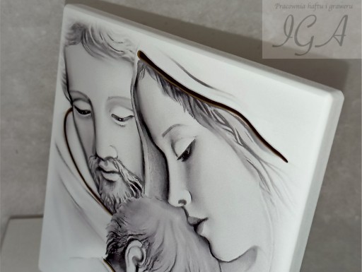 Obrazek malowany na drewnie, zdobiony złotą ręcznie malowaną farbą, przedstawiający wizerunek Świętej Rodziny.