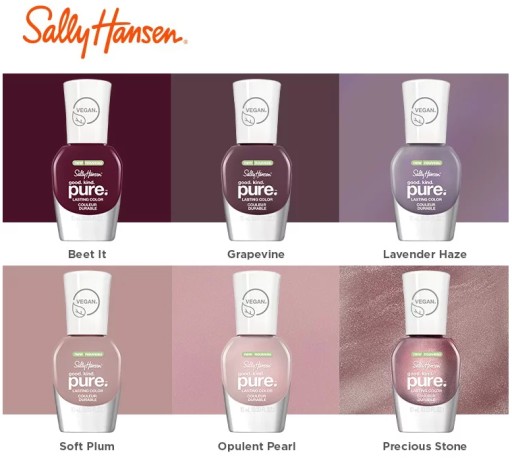 Opis: Pierwsze w 100% wegańskie lakiery do paznokci od Sally Hansen Good. Kind. Pure.™ Stworzone z miłości do natury lakiery oferują bogatą paletę barw i połysk bez kompromisów. Dostępne w 17 intensywnych kolorach. Aż 77% składników jest pochodzenia naturalnego, a wegański pędzelek idealnie współgra z nową formułą lakieru.