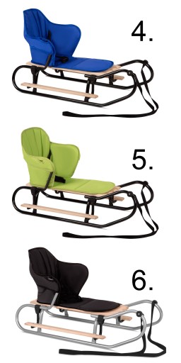 Materacyk nakładany na oparcie. Dodatkowo z przodu materaca gumka nakładana na przód siedziska która powoduje, że materacyk nie zsuwa się z sanek.