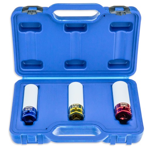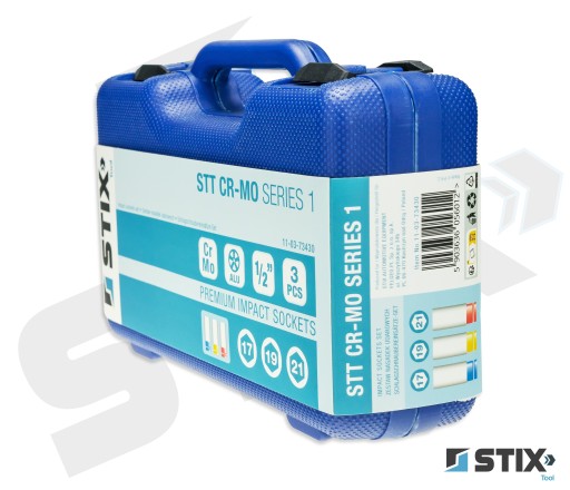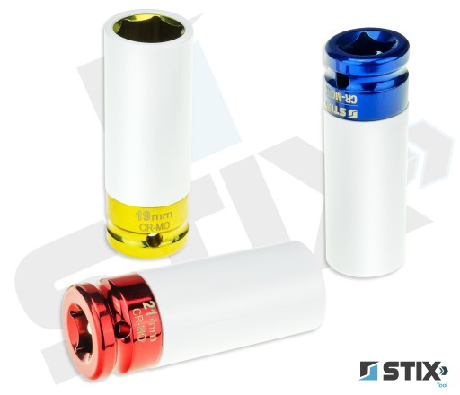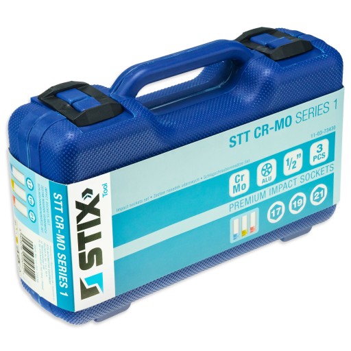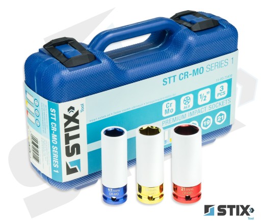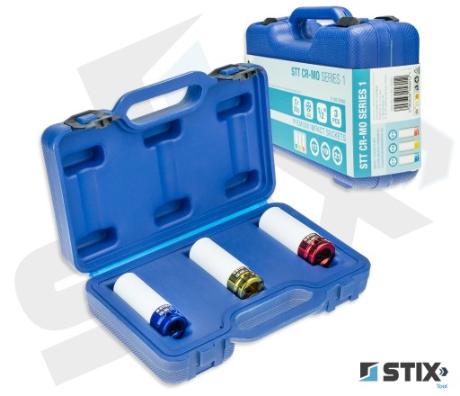 STT Series 1 marki Stix Tool to zestaw trzech długich nasadek udarowych (79 mm) przeznaczonych do odkręcania i dokręcania śrub oraz nakrętek mocujących felgi aluminiowe. Dzięki zastosowaniu osłon z tworzywa i wewnętrznych wkładek ochronnych, zapewniają bezpieczeństwo zarówno dla felgi, jak i powierzchni nakrętki. Wykonane ze stali CrMo, zapakowane w praktyczną walizkę.
