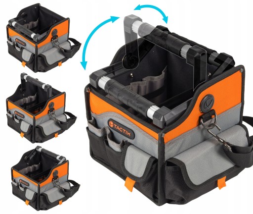 Torba narzędziowa 323161 marki Tactix wykonana została z grubego, mocnego, wodoodpornego materiału odpornego na uszkodzenia i przetarcia. Idealna do przenoszenia narzędzi ręcznych i innych małych przedmiotów. Przeznaczona dla elektryków, monterów, hydraulików lub cieśli. Wyposażono ją łącznie w 20 kieszeni - otwartych oraz zamykanych. Torba posiada wygodny, aluminiowy uchwyt do przenoszenia jej w dłoni, pas naramienny z ochraniaczem zapinany metalowymi zapięciami. W celu podniesienia wytrzymałości torba jest nitowana.