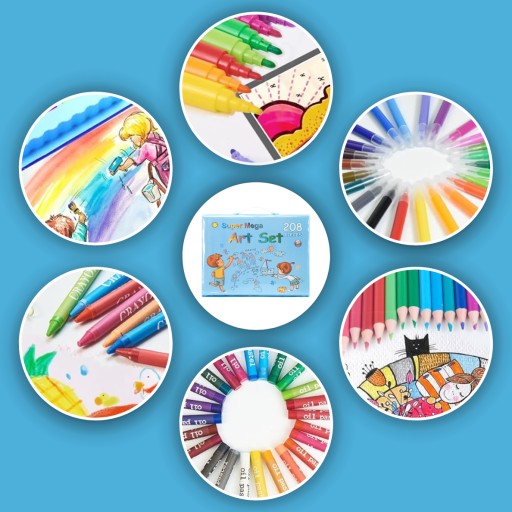 ✅ DUŻY ZESTAW 208 ELEMENTÓW – Zróżnicowana kolorystyka przyborów i możliwość doświadczania różnych technik rysunku pozwalają na nieograniczone pole do popisu dla wyobraźni dziecka.