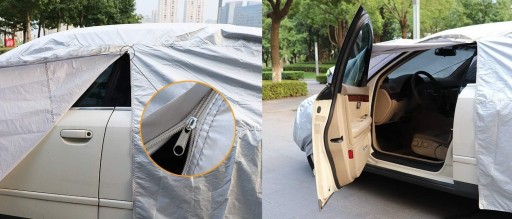 Pokrowiec samochodowy wyposażony jest w praktyczny suwak, który umożliwia szybkie i łatwe otwarcie drzwi kierowcy bez konieczności zdejmowania całego pokrowca. Dzięki temu można wygodnie dostać się do wnętrza pojazdu, co jest szczególnie przydatne w codziennym użytkowaniu.