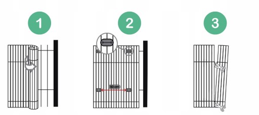 ✔️ Jeśli matę trzeba przyciąć, wykonaj to ostrożnie, pamiętając o pozostawieniu dodatkowego sznurka przez usunięcie kilku dodatkowych listewek. Po usunięciu lamel, ponownie zawiąż sznurki.