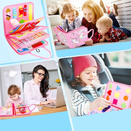 Nasza tablica do zajęć ma 8 stron do zabawy, dzięki czemu Twoje dziecko będzie zajęte przez wiele godzin. Ta tablica do zajęć Montessori została zaprojektowana na różnych poziomach trudności, aby stanowić wyzwanie, ale nie za dużo, aby zainteresować maluchy. Należą do nich klamry, zamki błyskawiczne, sznurowadła, paski, guziki, zegary, kalendarze, kształty, cyfry, alfabety na rzepy i litery 123, puzzle ze zwierzętami i wiele innych.