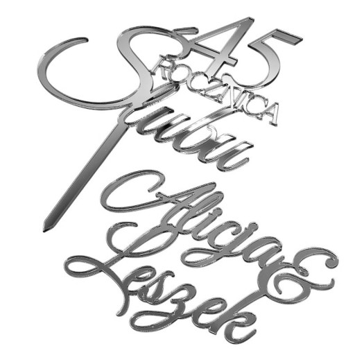 Ten srebrny, błyszczący zestaw rocznicowy na tort z liczbą i imionami to doskonały sposób, aby uczcić specjalną okazję i dodać ekscytujący akcent do Waszego tortu.