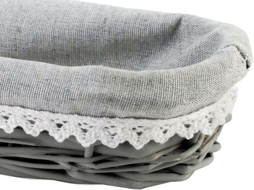 - Szary wiklinowy koszyk, wyściełany szarą tkaniną