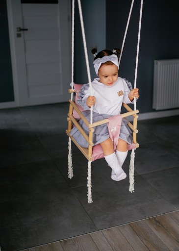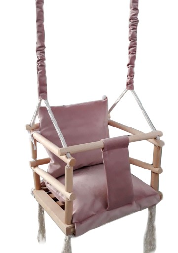 Huśtawka wykonana z delikatnego aksamitno pluszowego materiału, który jest bardzo miękki i delikatny w dotyku oraz bardzo wytrzymały.
