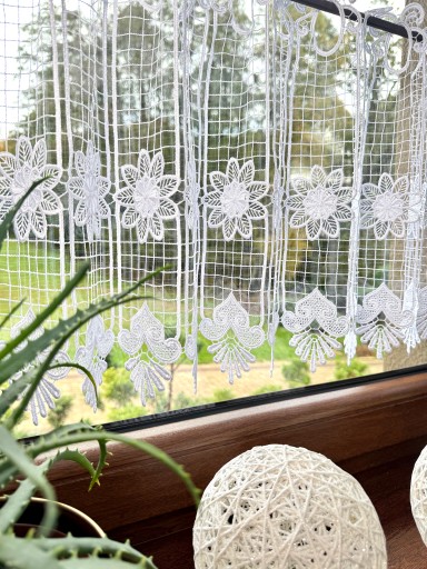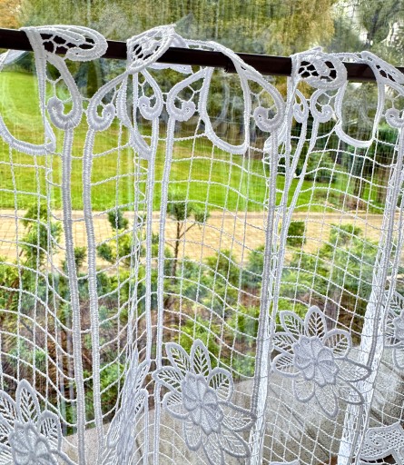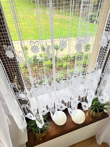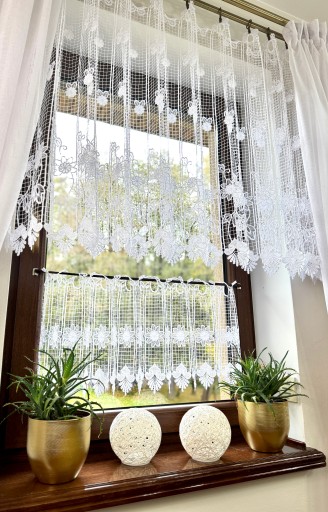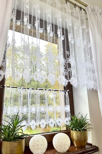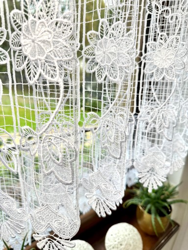 Przedmiotem sprzedaży jest gipiurowa śnieżnobiała firanka typu zazdrostka o wysokości całkowitej 40 cm, pomimo zastosowania techniki przeplatania nici w grupach firaneczka nie jest zbyt ciężka , zastosowany ażurowy wzór nadaje lekkości i przejrzystości Firaneczka jest cięta z walka i nie wymaga obszywania , bardzo ważną cechą jest również to że nie trzeba jej prasować, dodatkowa zaletą jest fakt że można taką zazdrostkę powiesić również na żabkach karnisza.