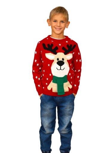 Czerwony sweter z dużym reniferem w szaliku 3D. Na całym swetrze rozmieszczone są białe gwiazdki. Sweter posiada okrągły dekolt. Rękawy i dół swetra zakończone są ściągaczami. Sweter jest gruby, ładnie uszyty.
