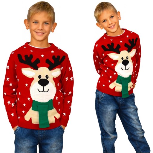 Czerwony sweter z dużym reniferem w szaliku 3D. Na całym swetrze rozmieszczone są białe gwiazdki. Sweter posiada okrągły dekolt. Rękawy i dół swetra zakończone są ściągaczami. Sweter jest gruby, ładnie uszyty.