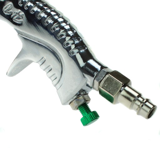 - powietrza (ustawianie ilości materiału w stosunku do powietrza) Regulacja powietrza odbywa się z wykorzystaniem regulatora powietrza zamontowanego przed pistoletem w sieci pneumatycznej oraz bardziej precyzyjnie za pomocą pokrętła w dolnej części rekojeści pistoletu.