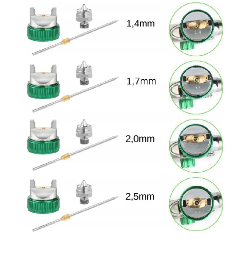 - 4x dysza z iglicami: 1,4 + 1,7 + 2,0 + 2,5 (trzy dostarczane osobno, jedna zamontowana w pistolecie)